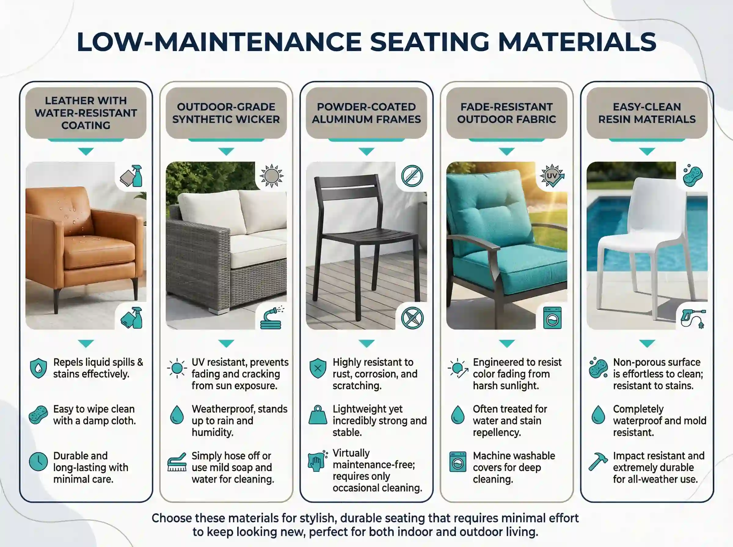 Low-maintenance seating materials offer significant advantages, including reduced time and effort for upkeep, enhanced durability, and long-term cost savings. These materials are designed to resist common issues like weather damage, stains, and wear and tear.